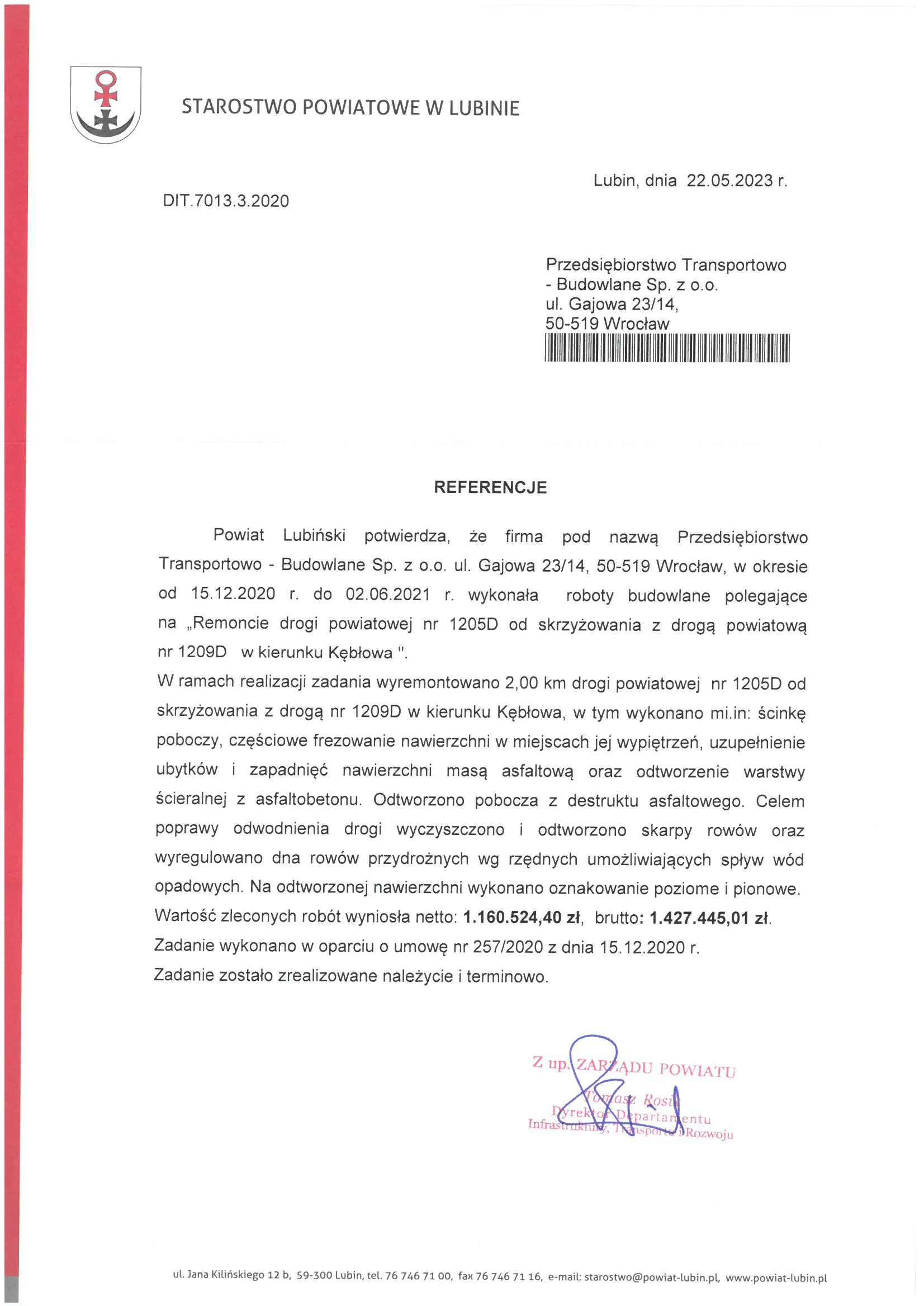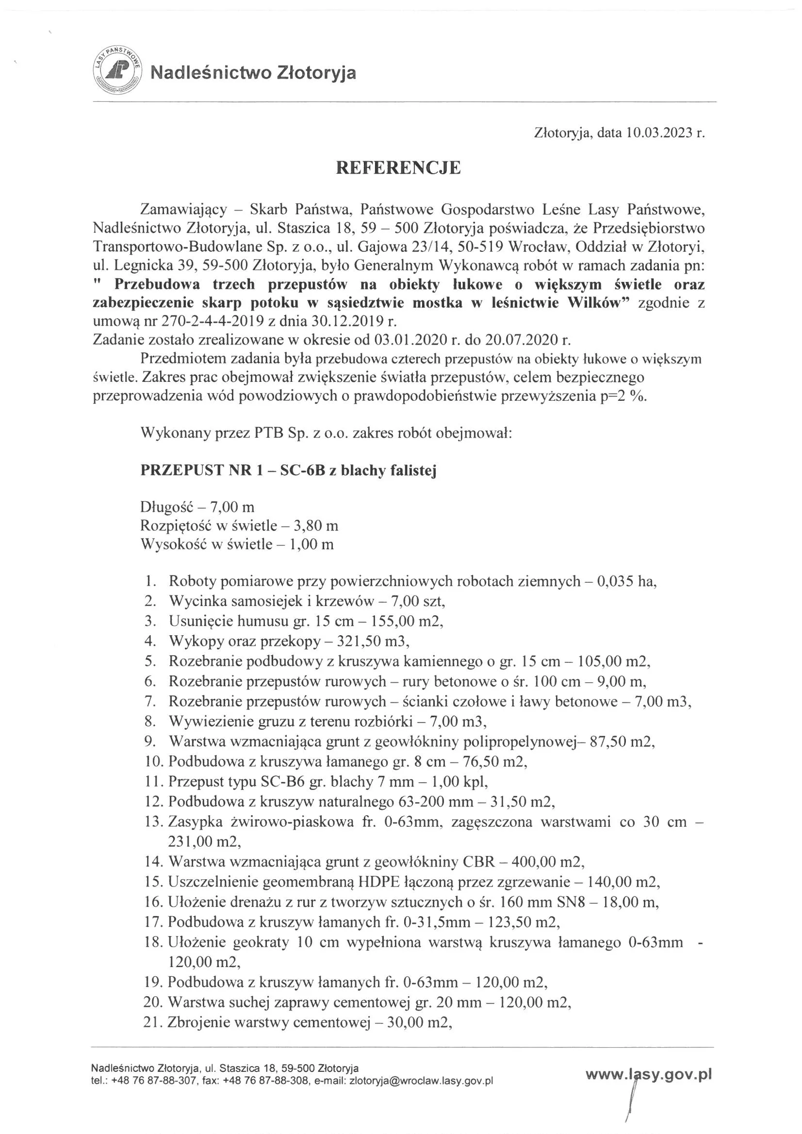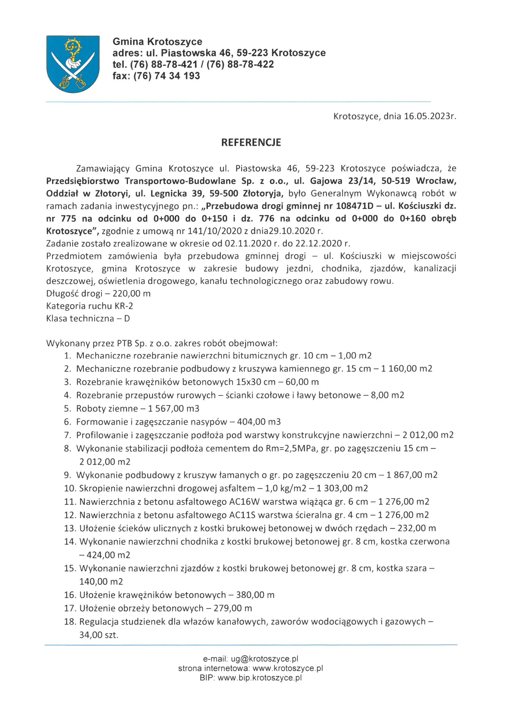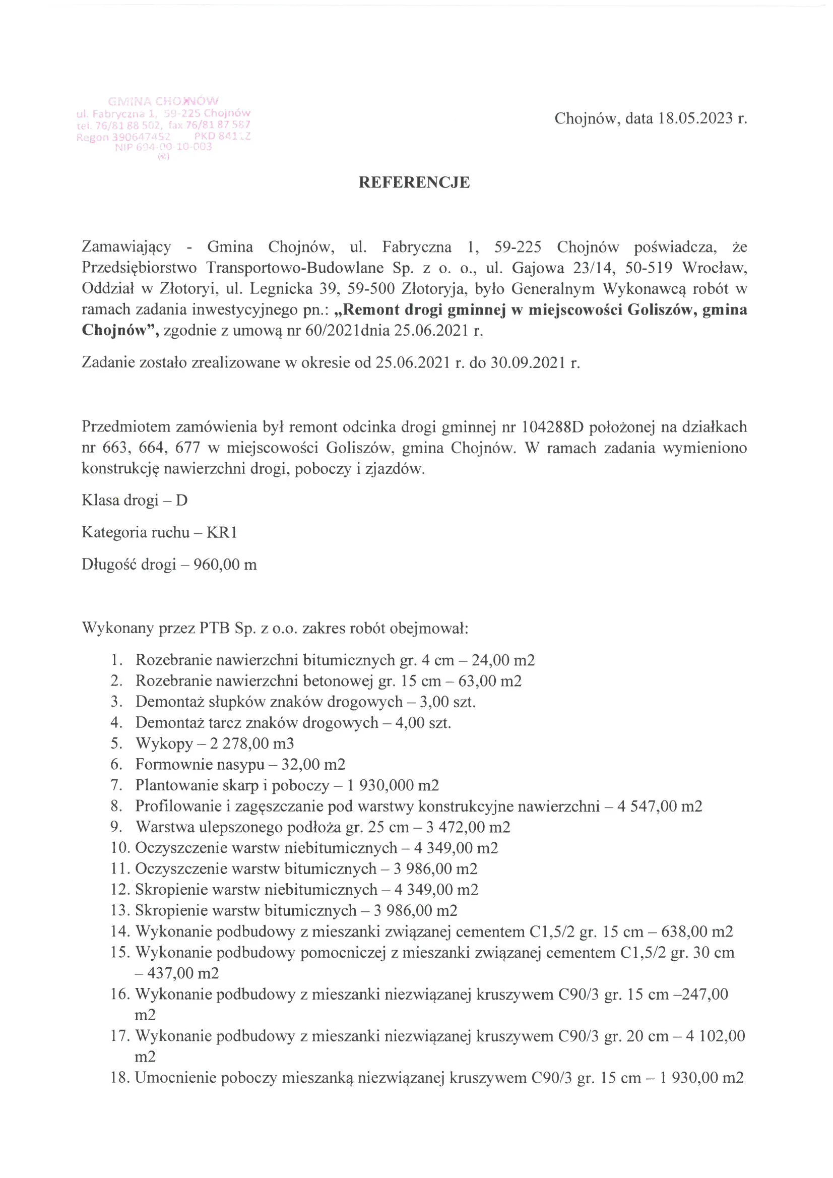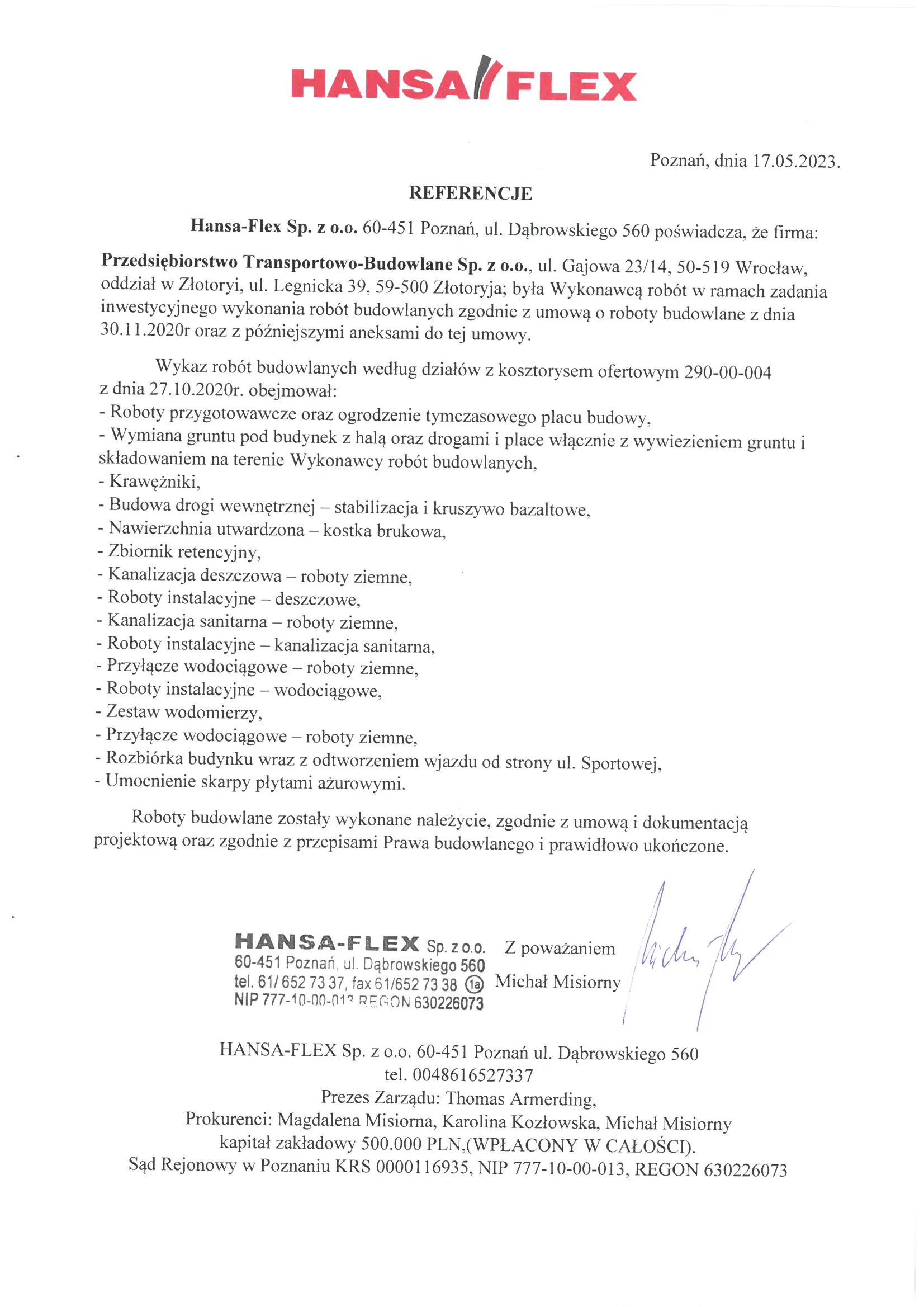 Referencje wystawione przez zamawiających po zakończeniu realizacji robót drogowych, ziemnych i infrastrukturalnych.